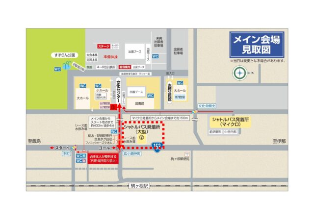 本年度大型シャトルバス発着場がメイン会場付近から広小路交差点(ゴール付近)に変更となっております。バス降車後は係員の指示でメイン会場までご移動ください。また、移動に伴い、早めのご移動、ご予定をお勧めいたします。